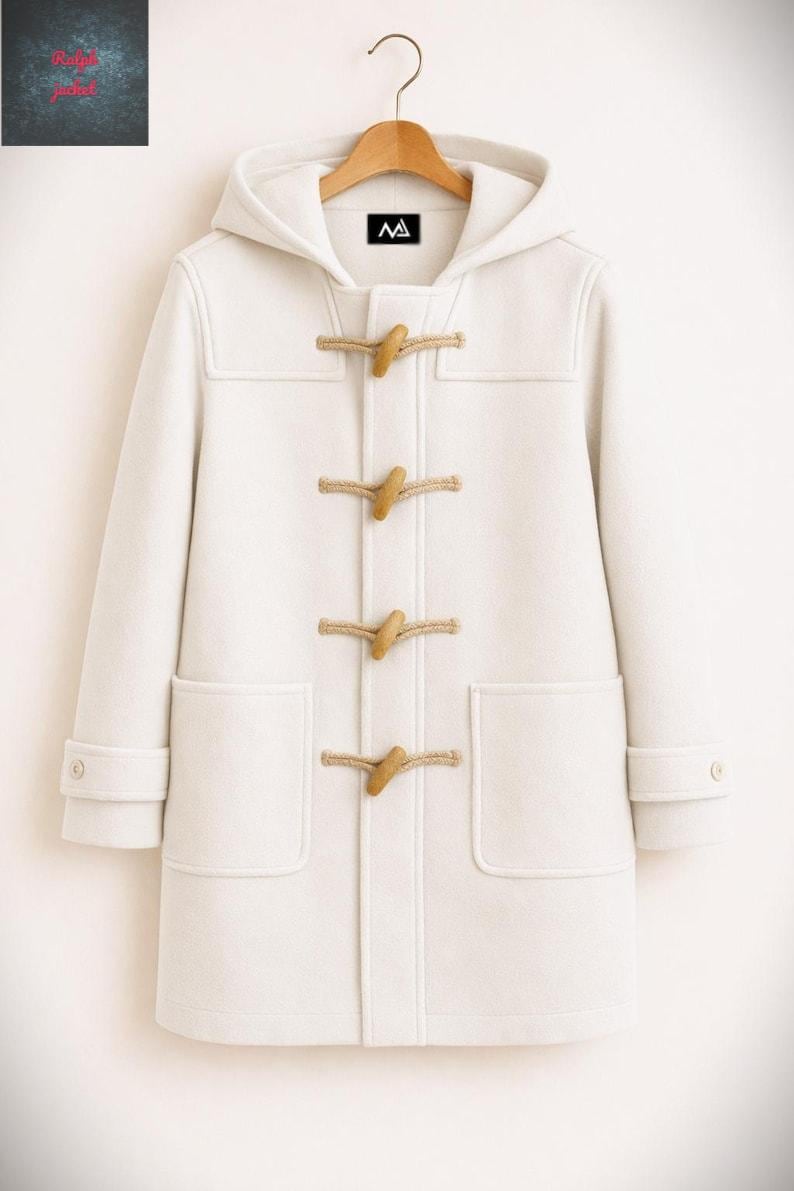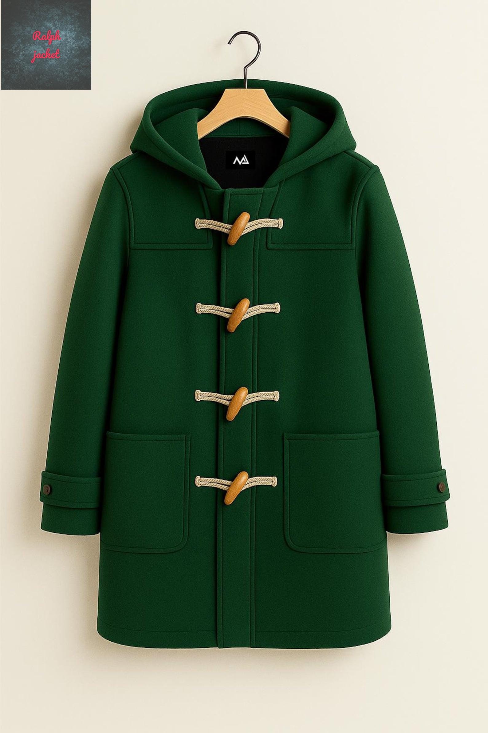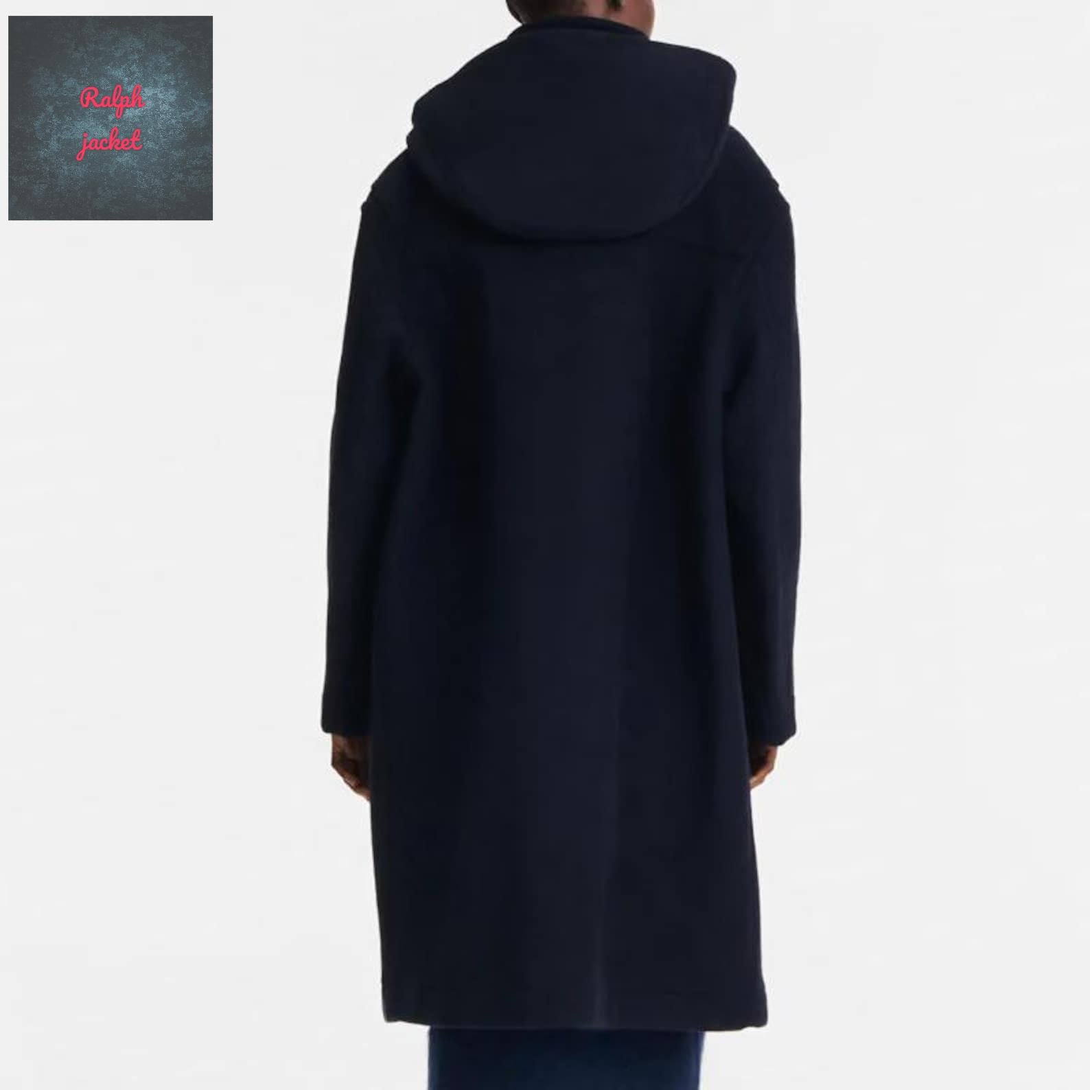 Handmade Wool Coat with Hood: Navy Blue Toggle Jacket, East London Style