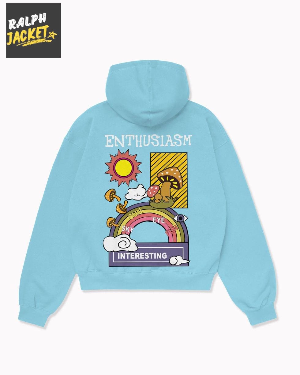 Handmade Enthusiasm Blue Hoodie - Mushroom Art Graphic Sweatshirt - Creative Unisex Streetwear Hoodie - Vibrant Rainbow Winter Wear