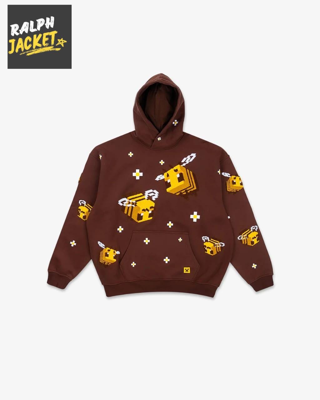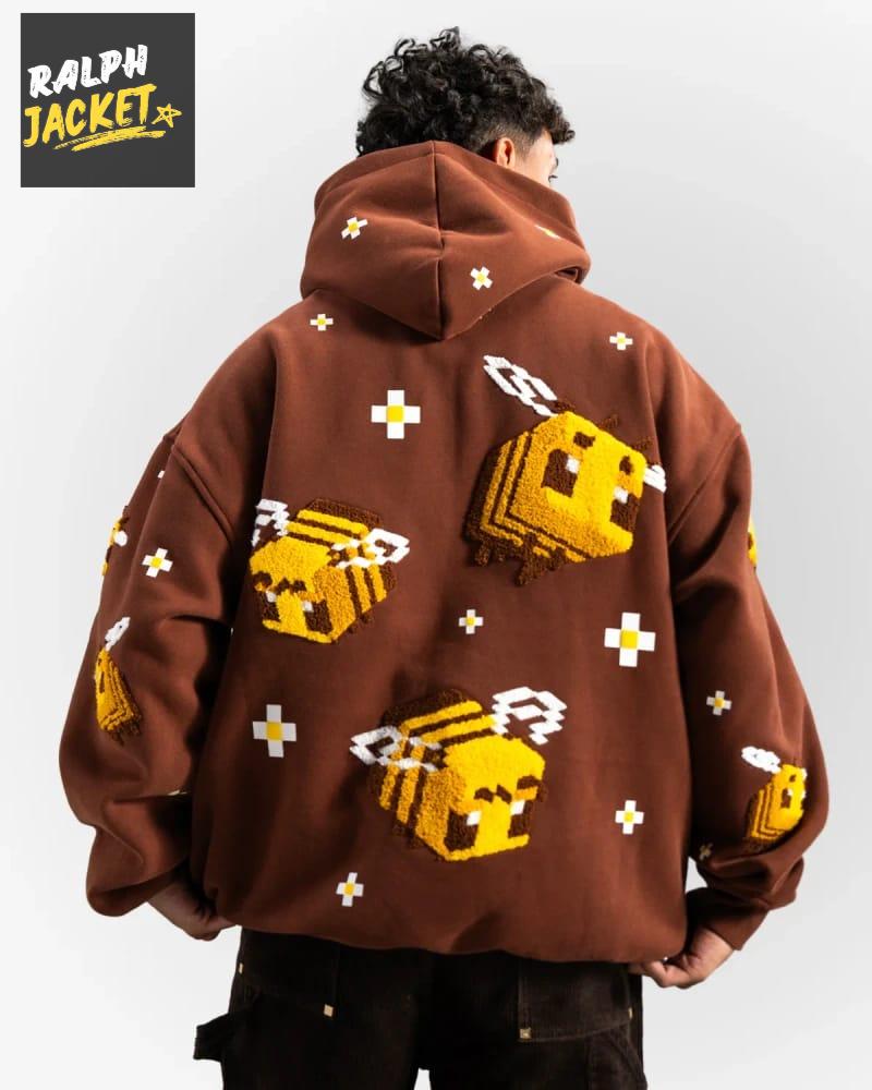Brown Pixel Bee Hoodie – 3D Embroidered Oversized Streetwear